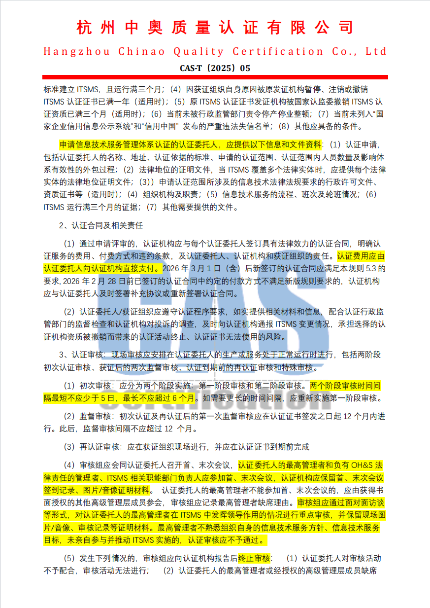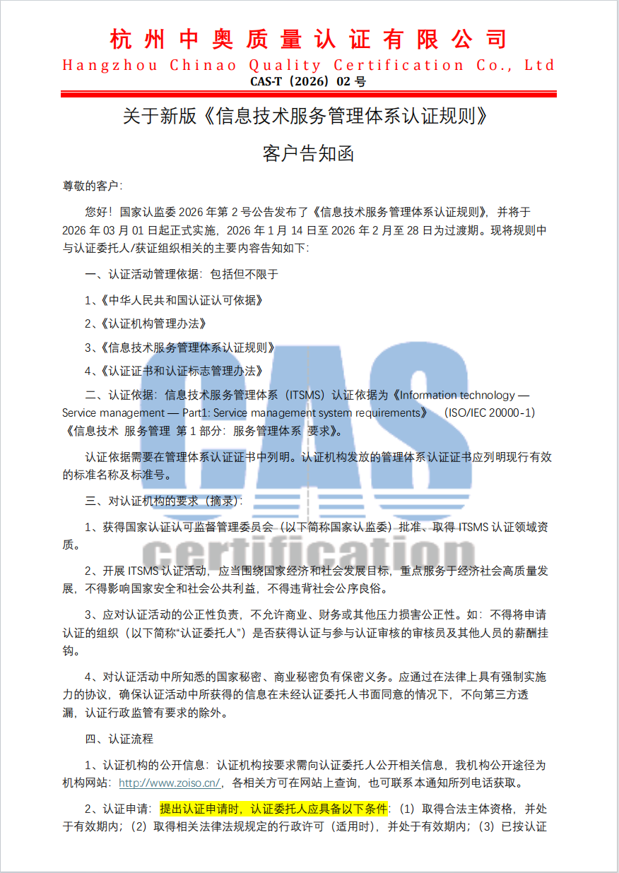 信息技术服务管理体系认证规则(2026版)客户告知函
